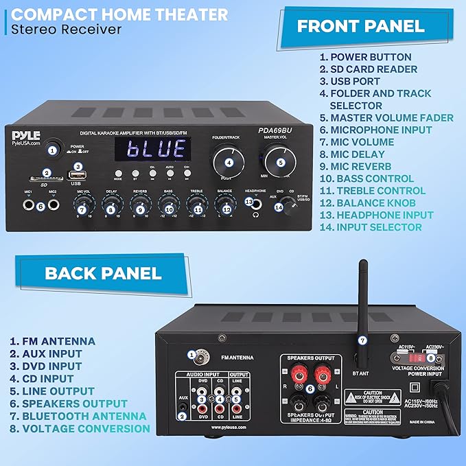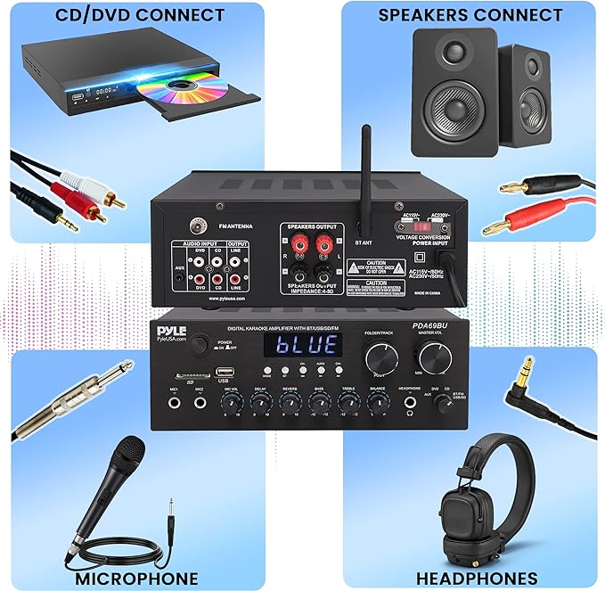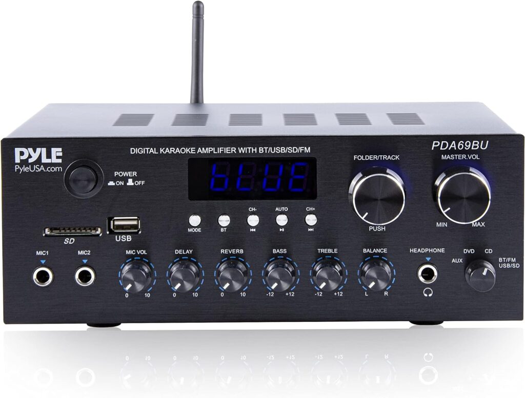 The Pyle PDA69BU is a 300W dual-channel stereo amplifier designed for home theaters and studio setups. It features Bluetooth connectivity, multiple input options (MP3, USB, SD, AUX, RCA, MIC, and FM), and customizable sound controls like reverb and delay. But is it the right choice for you? Here’s an in-depth look at its pros and cons based on specifications and user reviews.